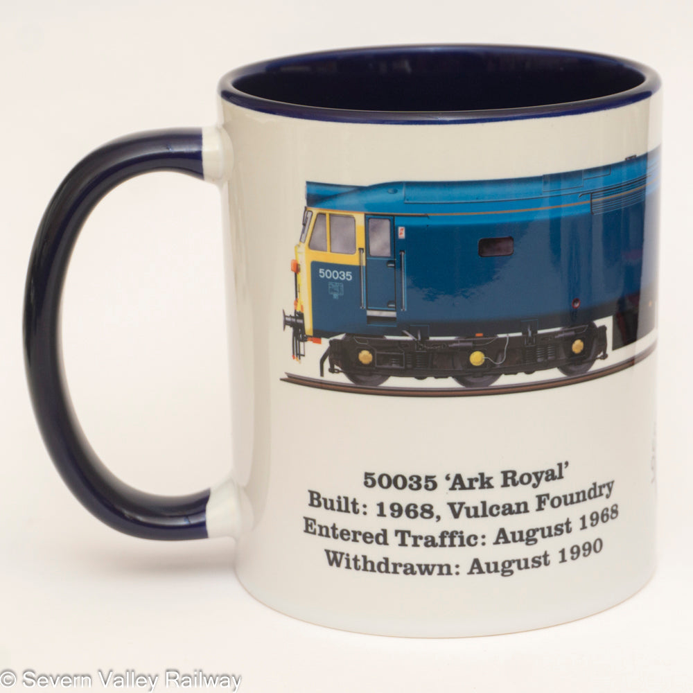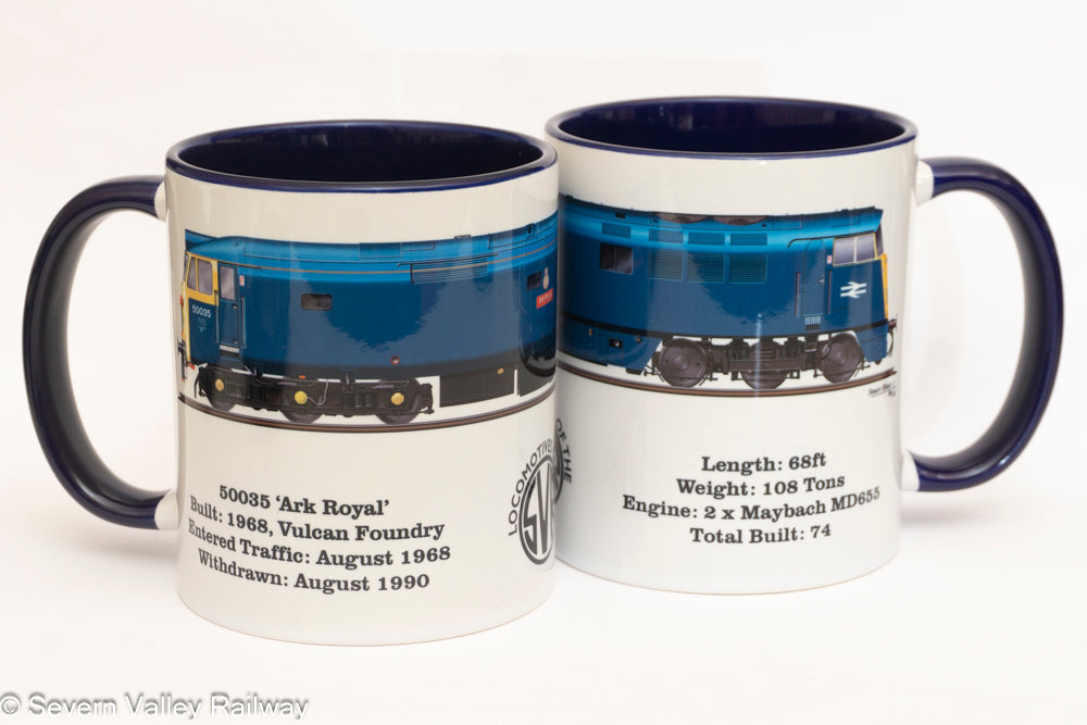 Each mug depicts a side view of the locomotive, with some information about the history of that loco below it.